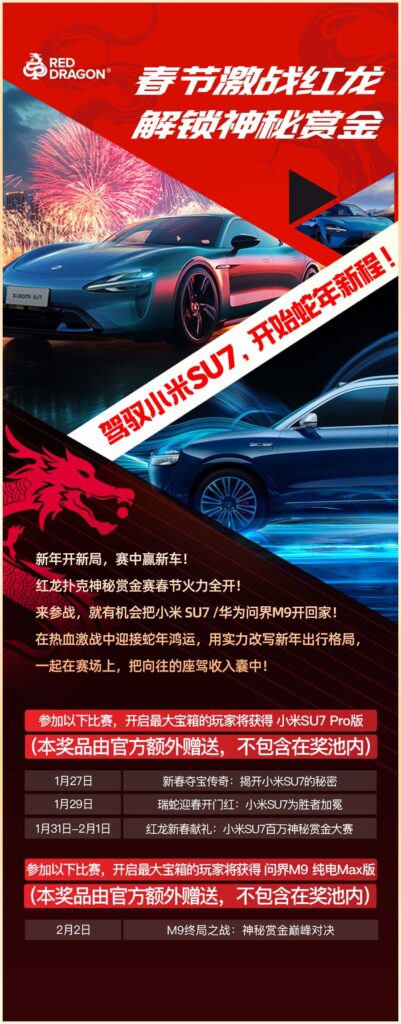 红龙扑克神秘赏金赛春节火力全开! 你准备好了吗?来参战,就有机会把小米 SU7以及华为问界M9开回家!在热血激战中迎接蛇年鸿运,用实力改写新年出行格局。无论你是扑克新手还是老将,只要你敢于挑战,赢得每一局,最终可能把心仪的座驾收入囊中!